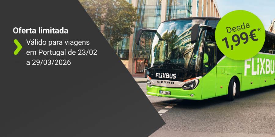 Sobe a bordo de um FlixBus e visita algumas das cidades mais famosas de Portugal. Quer estejas a explorar Lisboa, a passar um fim de semana em festa no Porto, a fazer um mergulho cultural em Coimbra ou a descobrir os tesouros escondidos de Faro, a nossa ampla rede de rotas de autocarro irá fazer com que experimentes tudo o que Portugal tem para oferecer sem esforço. Não percas também a oportunidade de visitar países próximos como Espanha, França, Itália: desfrutar de umas férias relaxantes ou de uma viagem de fim de semana é fácil e económico com a FlixBus!